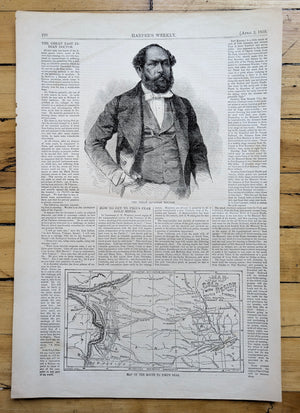 This is an intriguing map of the Colorado "Gold Region" surrounding Pike's Peak, that provides the primary routes and landmarks prospectors would encounter on their journey into the Western American Frontier. Dated April 2, 1859, this map and accompanying article is a wonderful period piece coinciding with start of 2nd great migration of gold prospectors heading west, known as the Colorado 59'ers.