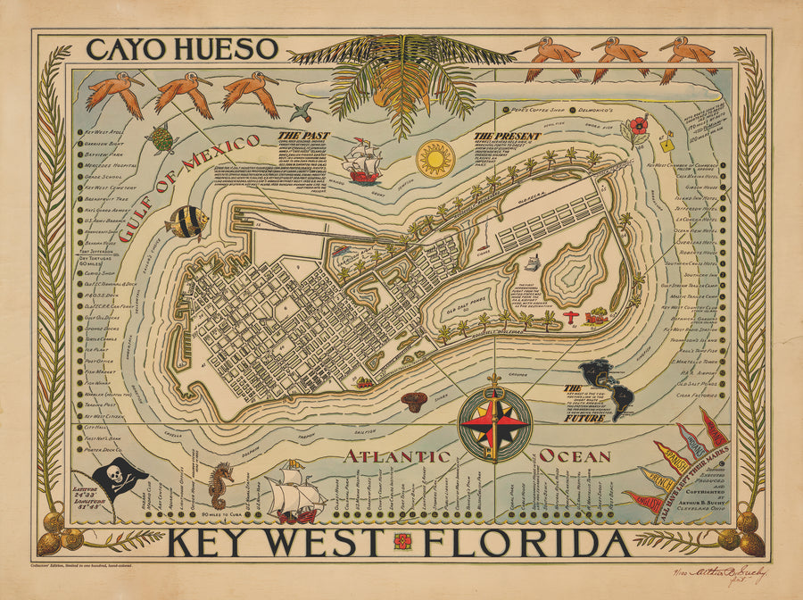 This rare illustrative map of Key West, Florida captures the character, charm, and evolving identity of the island during the World War II era. Produced by Arthur B. Suchy as one of only 100 hand-colored limited edition prints, this example contains "9/100" and his signature in the lower right.